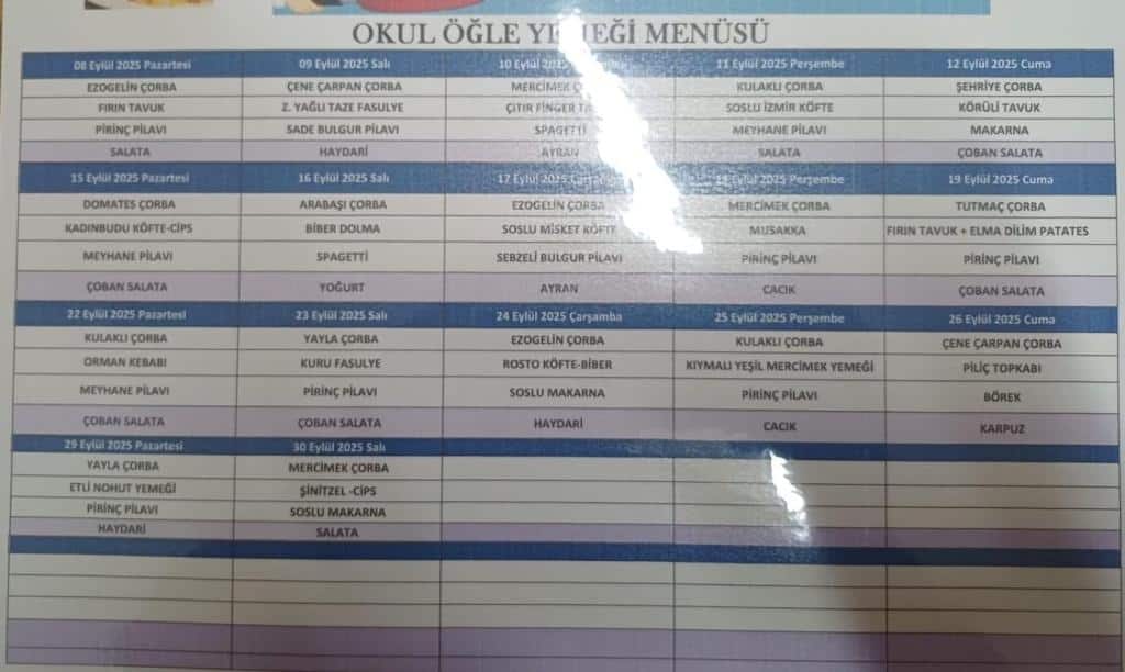Eylül ayı yemek listesi aşağıdaki gibidir.